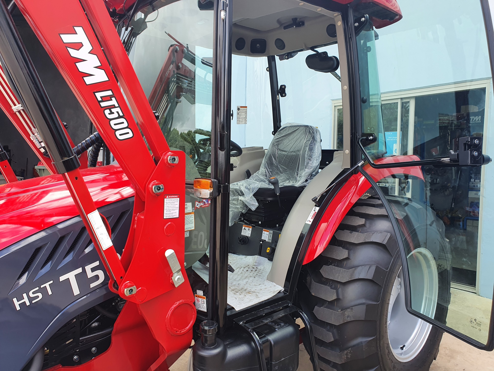 Powered by 50hp Perkins naturally aspirated 4 cylinder water-cooled Diesel enginePerkins Diesel is a global engine manufacturer of quality, giving you the confidence in relaibility and after-sales supportEngine certified to meet the stringent Tier III engine and noise emission standardsLoad sensing control Load sensing control prevents engine from stalling during heavy loadsCruise control with increase/decrease button2216cc engine with 142.7Nm of torque at 1800rpmA generous engine capacity of 2216cc, resulting in high torque for serious workDual dry element air cleaner for Australia's dusty conditionsA large capacity 60 litre fuel tank for many working hours between refuelingDRIVELINET503 Transmission T503 Transmission The tractor weight of 1710kg (ROPS version) is a reflection of the heavy duty transmission, driveline and axles. The tractor weight is in part, a result of the heavy front axle, which is important for a tractor fitted with a front end loader as substantial loads are applied during loader operationSee optional front end loader for detailsTYM T503 HST Pedals Three (3) range Hydrostatic transmission gives infinitely variable driving speed from stationary to 26 km/h in forward or reverse directionHydrostatic drive controlled by Independent Forward and Reverse pedals for easy simple operationErgonomic side by side foot control reduces fatigue and errorsMode sensitivity switch allows the operator to change HST pedal response time through 3 different modesTYM T503 Front Axle The heavy duty front axle performs in tough working conditions and handles loads with easeA long wheel base and wide stance increases stability in all conditionsTYM T503 Manual Diff Lock Rear axle with diff-lock for difficult traction situations4WD and the diff -lock provides better traction, control and performance4WD mode is controlled by a lever on the left hand side of the operatorTYM T503 Turning Brakes Inboard wet disc brakes can be split for indpendent left and right side braking to assist turning in tight situationsPTO, HYDRAULICS & LINKAGETYM T503 Remote Controls Control for the linkage and hydraulic remotes are on the right-hand sideThe 3-point linkage has postition and draft controlDraft control automatically lifts the ground engaging implement from the soil, when excessive load is experiencedHydraulic remotes are ideal for the operation of log splitters, post hole augers and a wide range of implementsTYM T503 Rear 2 sets of double-acting hydraulic remotesCategory 1 3-point linkage with 1503kg lifting capacity gives the tractor great versatility and range of applicationsTelescopic extendable lower link arms for easy implement connectionsTYM T503 PTO TYM T503 PTO The PTO driveline is a simple and direct design for high efficiency and powerThe PTO clutch is an independant oil immersed clutch pack for long life with simple push-button operationAuto-PTO function automatically disengages the PTO when the linkage is raised, and automatically reengages when lowered; a great functin that simplifies repeated row work and prevents implement damageOPERATOR AREATYM T503 Operator Area Air-conditioned cabin with sunroof and CD playerErgonomic design with easy to reach controlsEasy to read instrument panelSide mounted cabin air intake filtersDigital hour metre displayPTO On/Off SwitchSide opening windowsFront and rear windscreen washers and wipersFront and rear cabin mounted working lightsTYM T503 Tiltable Steering Wheel Tiltable steering wheelT503 Joystick Fully integrated joystick for control of front end loader with electric button for third function operation (when fitted)See optional front end loader for detailsTYM T503 Manual Floor Wide distance between rear mudguard and dash panel provides easy access on and off the tractorUncluttered flat floor without trip hazards is the largest surface area in its classRubber floor mat reduces noise and provides an easy to maintain surfaceTYM T503 Adjustable Suspension Seat Adjustable suspension seat for comfortOPTIONSFRONT END LOADERTYM T503 Optinal Front End Loader Level lift front-end loader ideal for materials handling and utility work around the farm or property